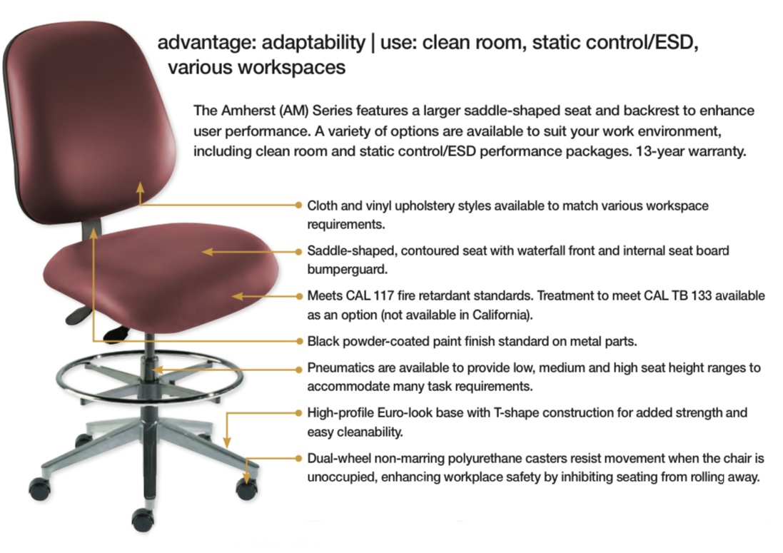 Amherst Series | Standard Components 21"W x 19"D x 3"T seat, 18"W x 19"H backrest with lumbar support and plastic protective panel, soft touch pneumatic seat height adjustment; fixed rearward 3.5° seat tilt, backrest tilt and backrest height adjustment, grade 2 upholstery